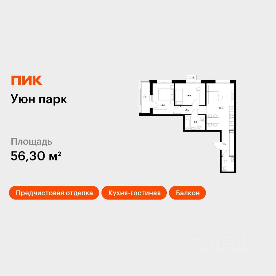 Продаётся 2-комн. квартира площадью 56,3 кв.м на 17 этаже 17 этажного дома (Корпус 14, Секция 1) проекта ПИК Уюн парк. Светлый просторный подъезд на уровне земли, функциональная планировка, большие окна, .