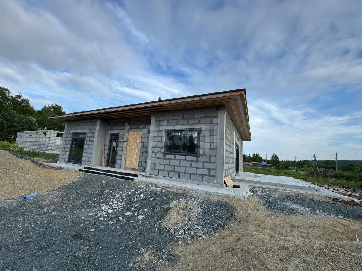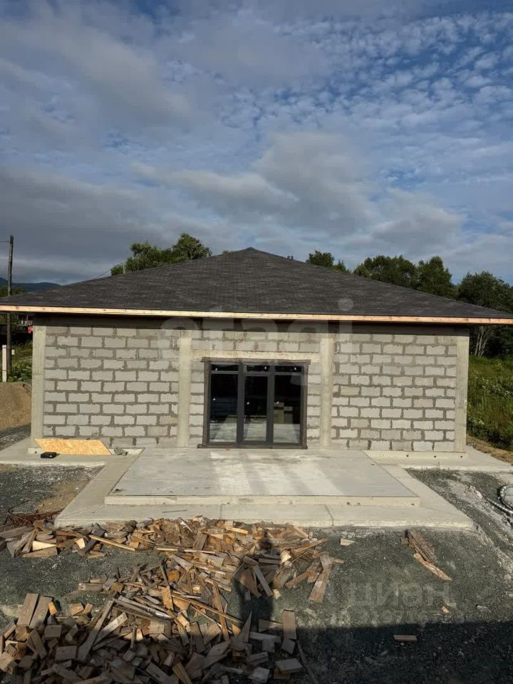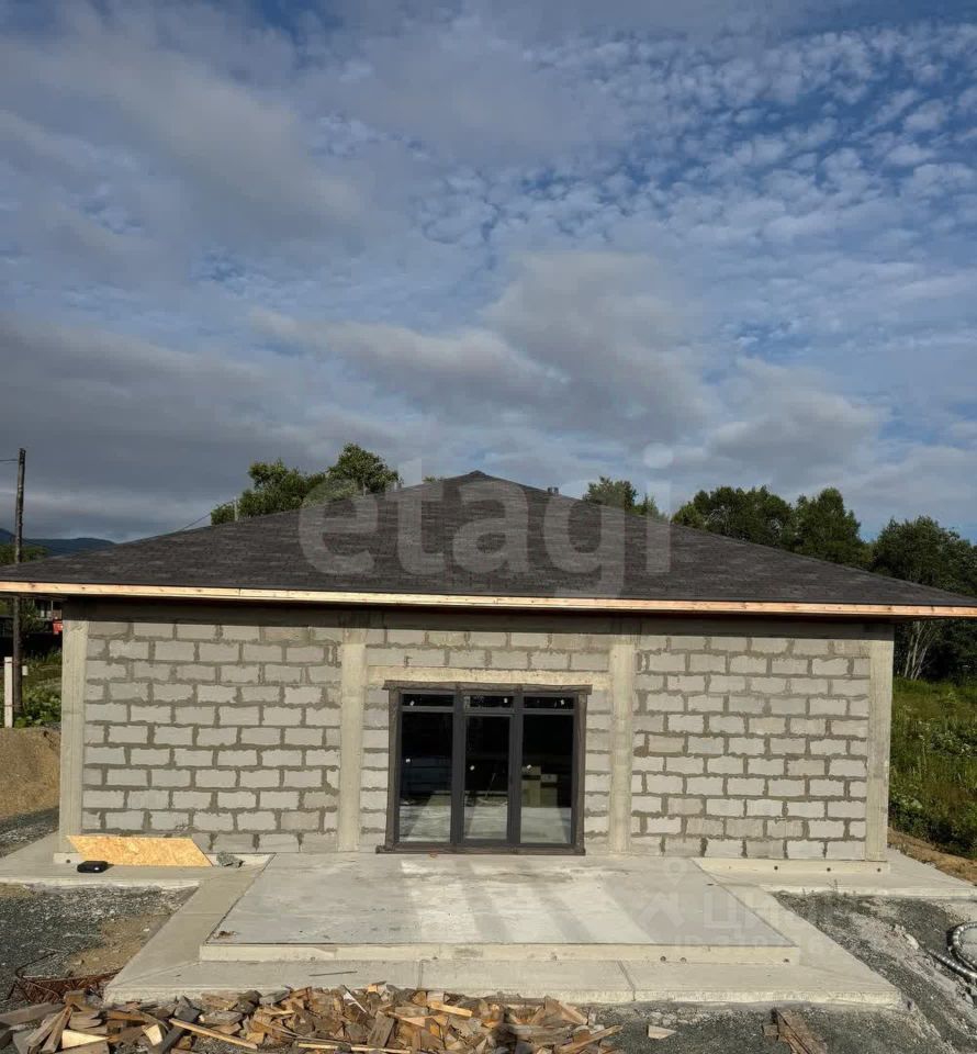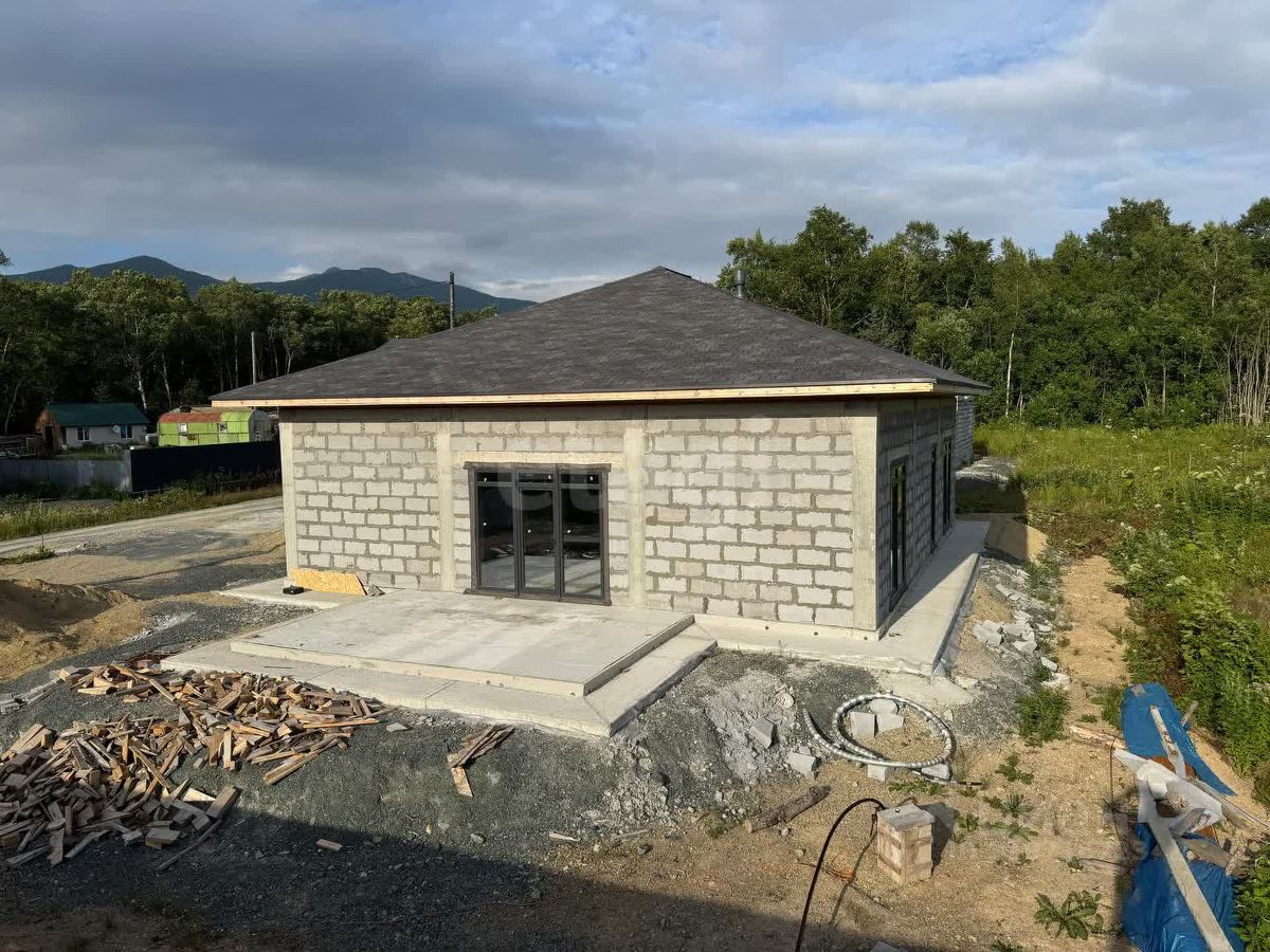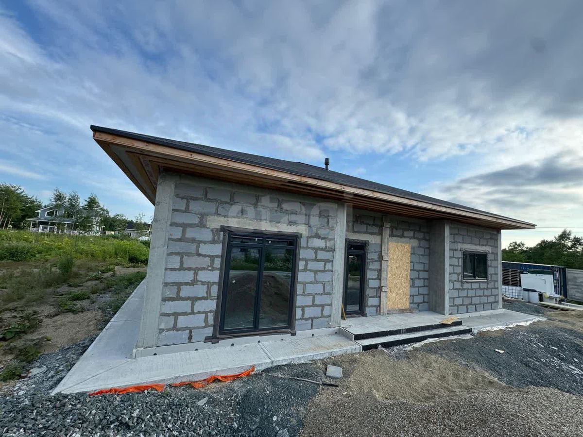 Дом расположен в экологически благополучном районе Южно-Сахалинска, в СНТ ''Ручеек'' на 4 км Охотской трассы. Объект построен по проекту Санкт-Петербургского бюро с соблюдением всех строительных норм. Площадь дома продумана для комфортного проживания: просторная кухня-гостиная с панорамными окнами и выходом на террасу создает ощущение простора, а две большие спальни обеспечивают уединение. Дополнительные удобства включают котельную, два гардероба, прачечную, кладовую и два санузла. Высота потолков 3,4 метра усиливает ощущение простора, а панорамное остекление наполняет помещения естественным светом. Крыша выполнена в четырехскатной конструкции с покрытием из гибкой черепицы DOCKE, что гарантирует долговечность и защиту от осадков.