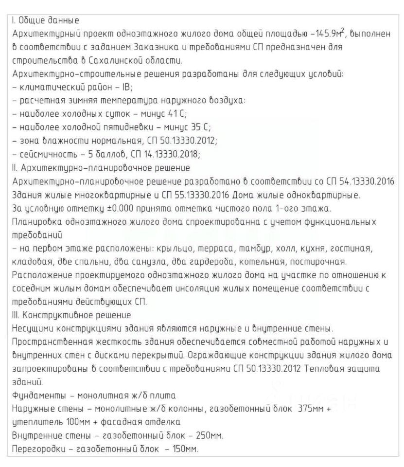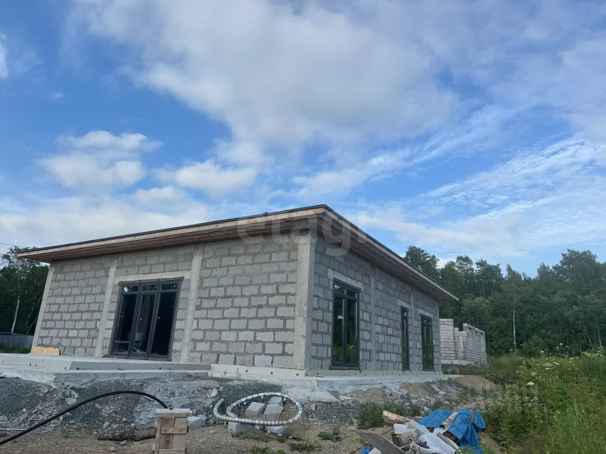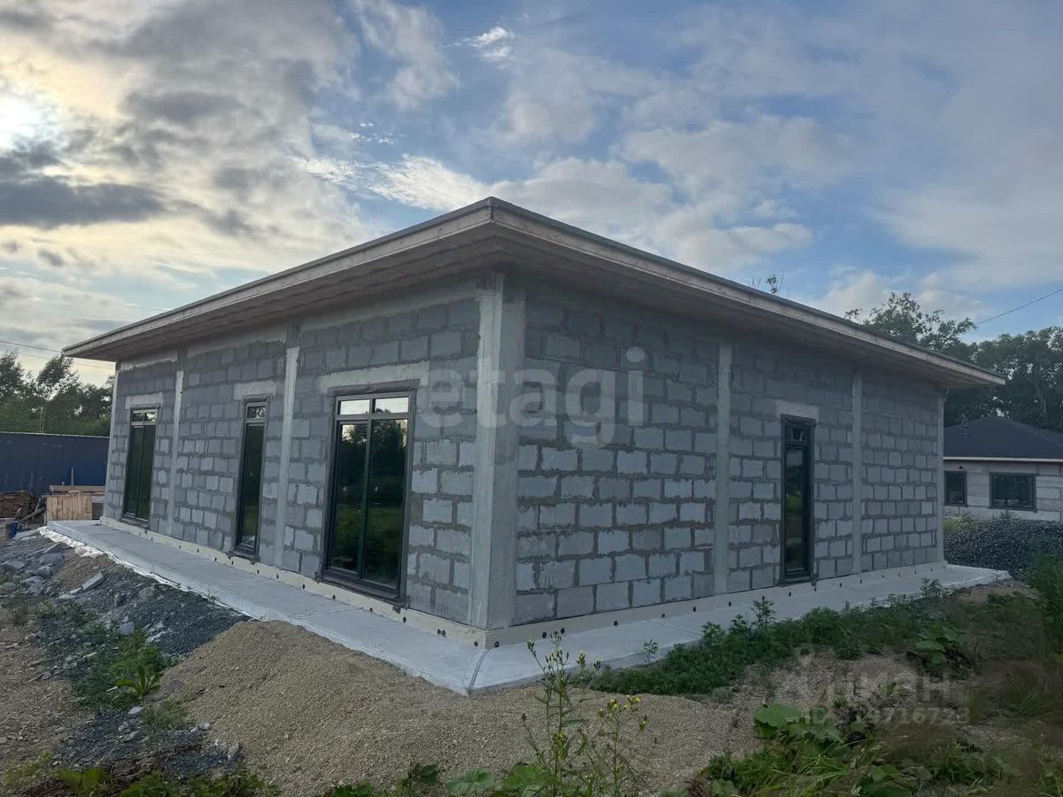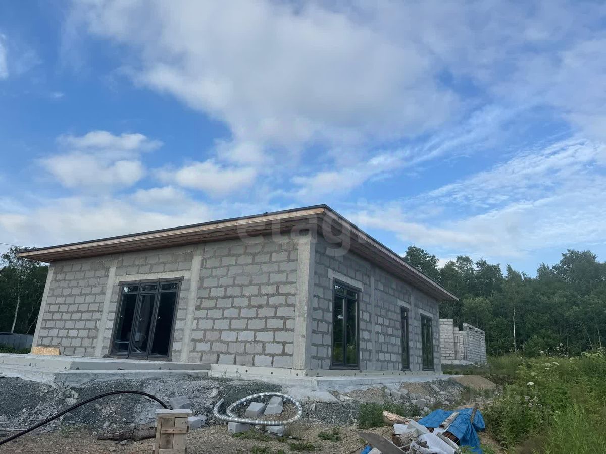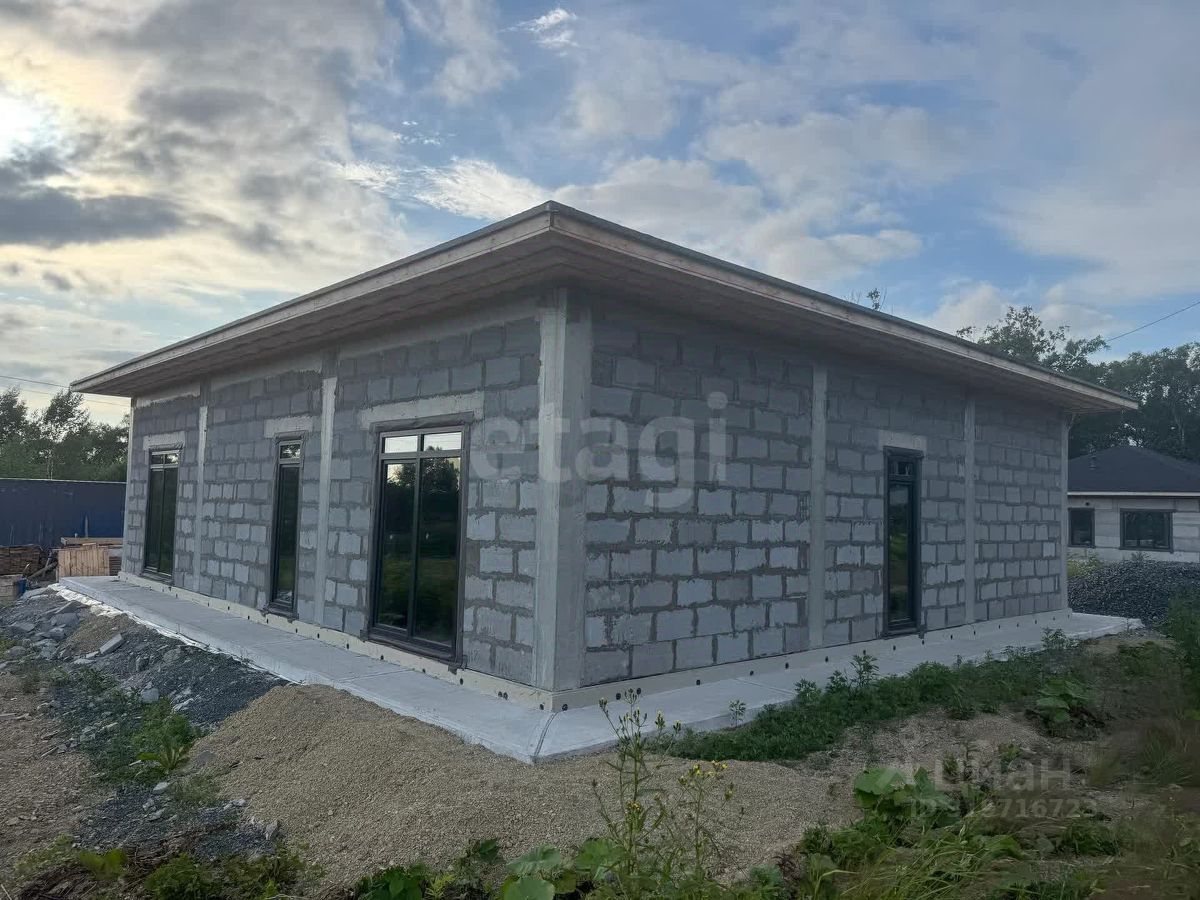 Дом расположен в экологически благополучном районе Южно-Сахалинска, в СНТ ''Ручеек'' на 4 км Охотской трассы. Объект построен по проекту Санкт-Петербургского бюро с соблюдением всех строительных норм. Площадь дома продумана для комфортного проживания: просторная кухня-гостиная с панорамными окнами и выходом на террасу создает ощущение простора, а две большие спальни обеспечивают уединение. Дополнительные удобства включают котельную, два гардероба, прачечную, кладовую и два санузла. Высота потолков 3,4 метра усиливает ощущение простора, а панорамное остекление наполняет помещения естественным светом. Крыша выполнена в четырехскатной конструкции с покрытием из гибкой черепицы DOCKE, что гарантирует долговечность и защиту от осадков.