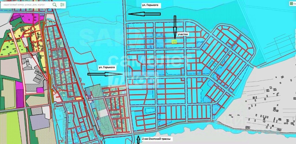ул. Благодатная 8 и 10. За воинской частью в Хомутово с восточной стороны. . По проекту в этом микрорайоне будет проходить ул. Горького с выходом на второй километр Охотской трассы. На фото всё подробно отмечено. Отличное вложение в будущее. Кадастровые номера 65:01:1001006:34 и 65:01:1001006:36.