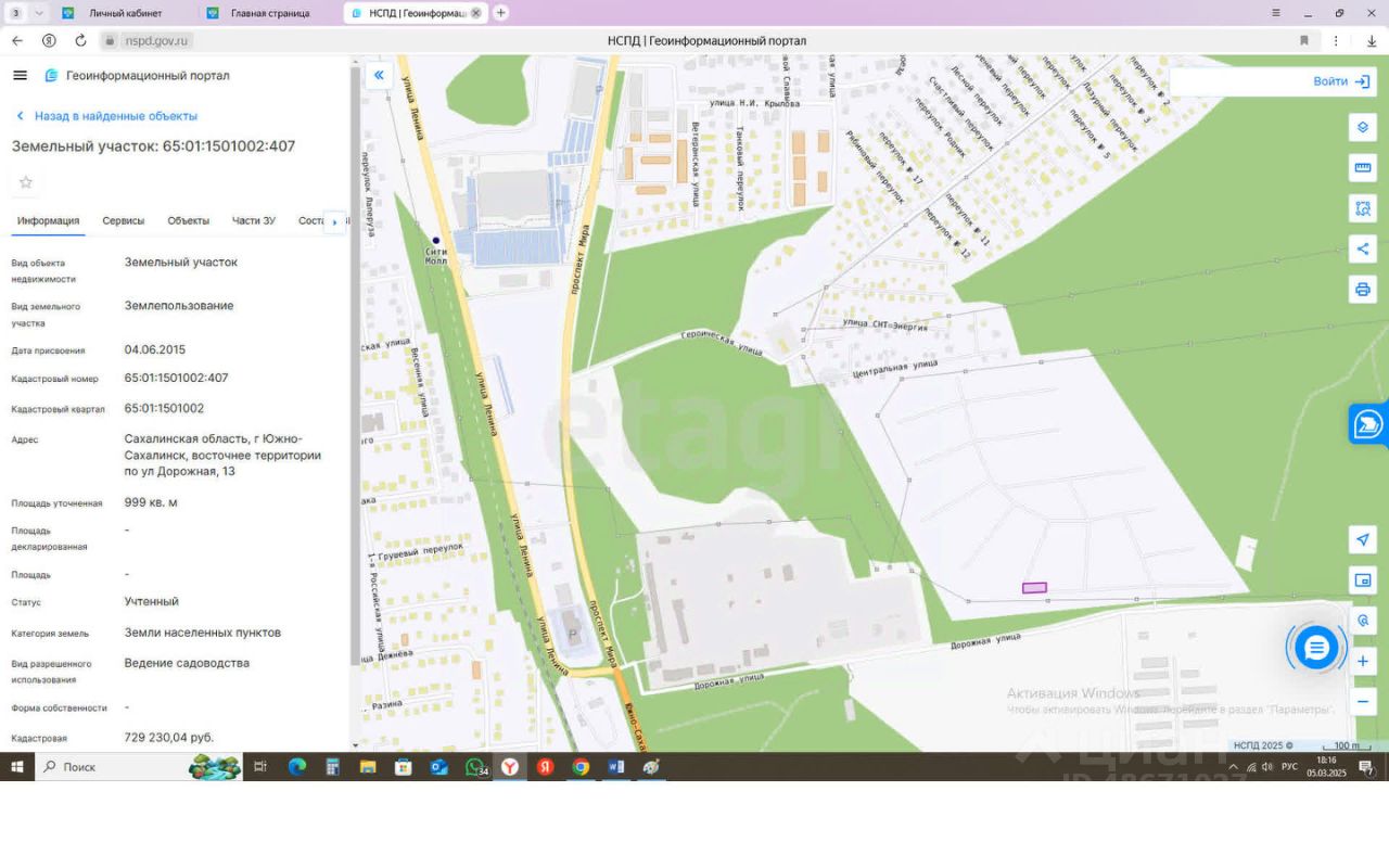 Продается земельный участок 9,99 соток в собственности, в ДНТ (дачное некоммерческое товарищество) ''Жемчужное'' восточнее района ''Поле Чудес''. Участок расположен в районе пл. р. Хомутово на восток, на перекрестке улиц Ленина- пр. Мира, проезжаем мимо ''Экспромт'' на восток 1 км по ул. Дорожной. Дорога частично заасфальтирована. Лесная зона, перспективный район, планируется газификация. Улицы нарезаны, участки размежеваны, установлены столбы электропередачи. Кадастровый номер - 65:01:1501002:407. Строится можно, на территории уже возводят дома. Удобная транспортная развязка. Имеется автобусная остановка (на перекрестке пр. Мира и ул. Ленина. Неподалеку Сити Молл, Аква Сити, торговые павильоны, в 2024 году построены два детских сада и школа в номом районе ЖК ''Горизонт''. На территории есть еще участки.