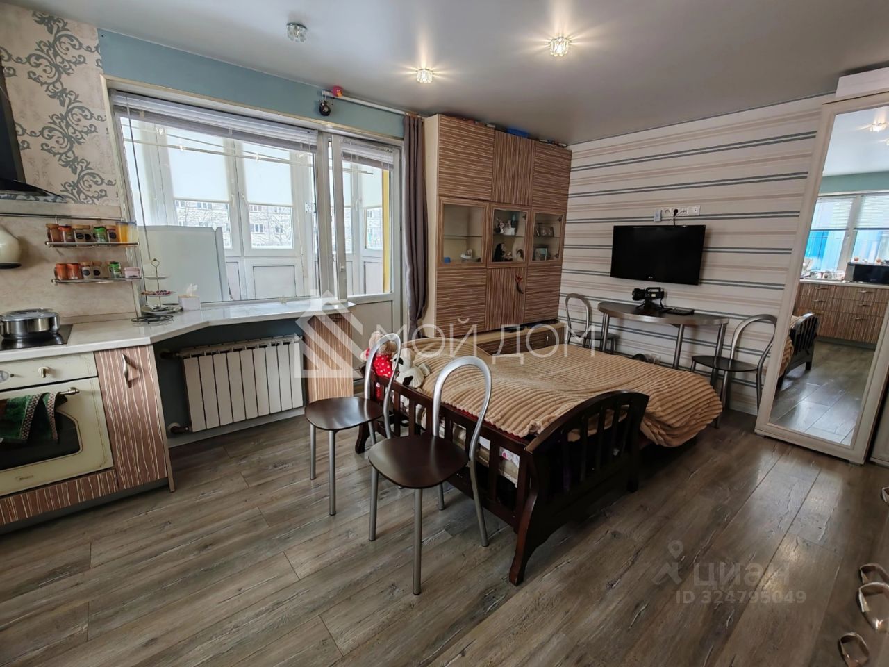 Квартира полностью отремонтирована и оснащена всей необходимой мебелью и бытовой техникой. Пол покрыт ламинатом, стены оклеены обоями, потолки натяжные. Окна и балкон выполнены из ПВХ.