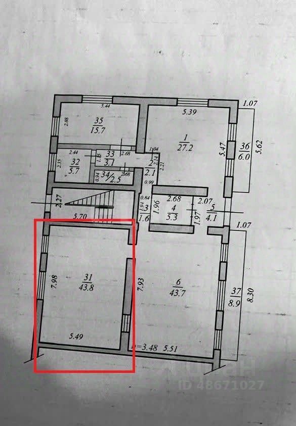 Общая площадь 43,8 кв.м. Свободная планировка. Косметический ремонт. Сан.узел общий на этаже. Оплата 153 000 плюс ком.услуги.